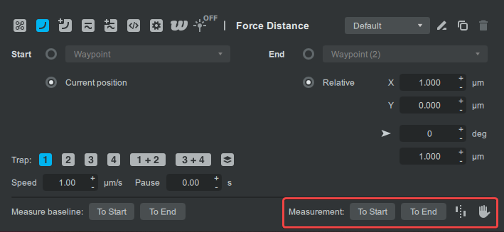 The measurement can be done using the “To Start”, “To End” and ping-pong buttons. It can be stopped at any time using the stop icon. The behavior depends on the type of start and end positions selected:
